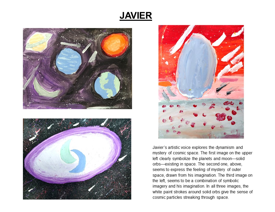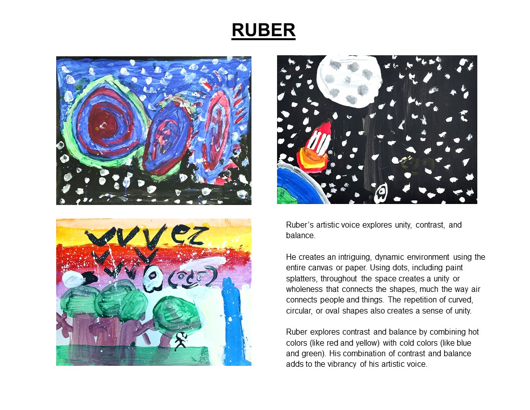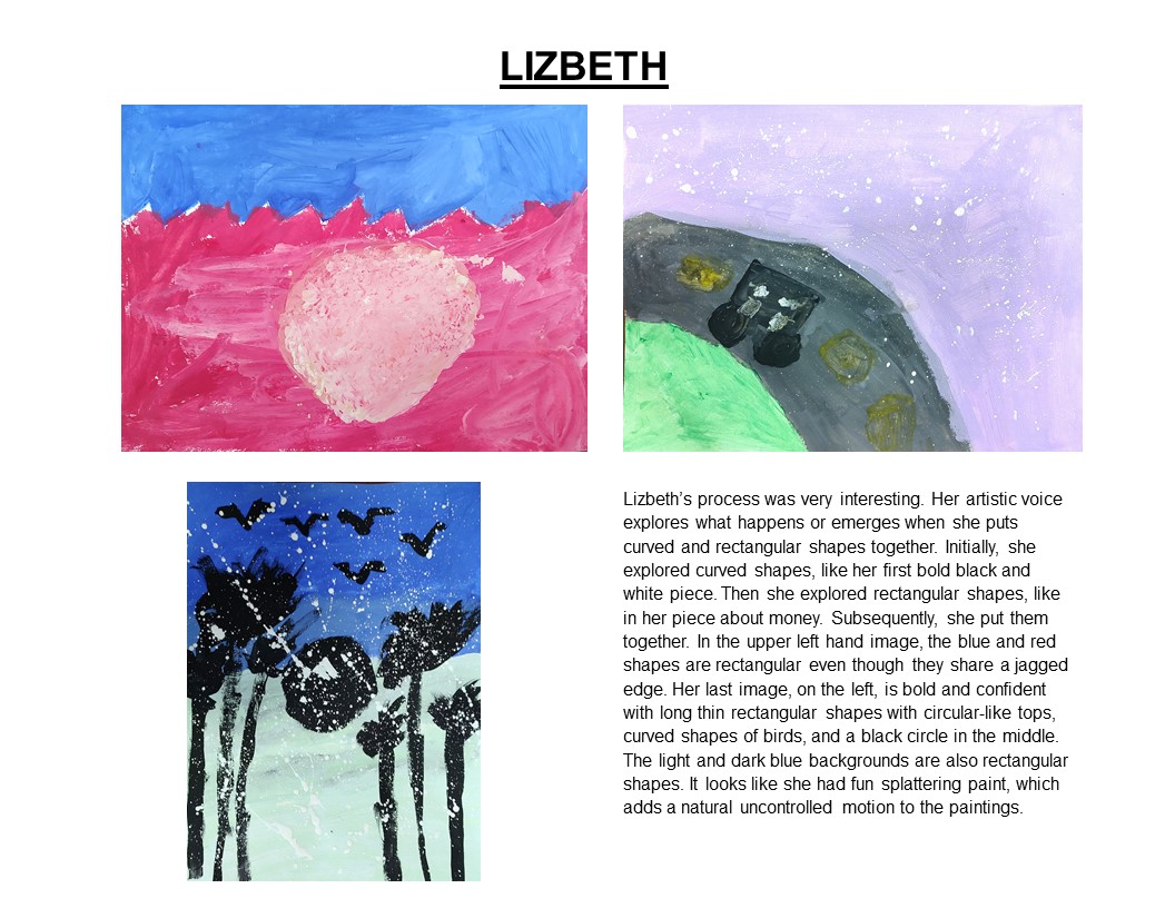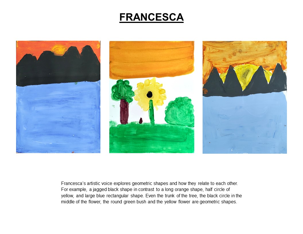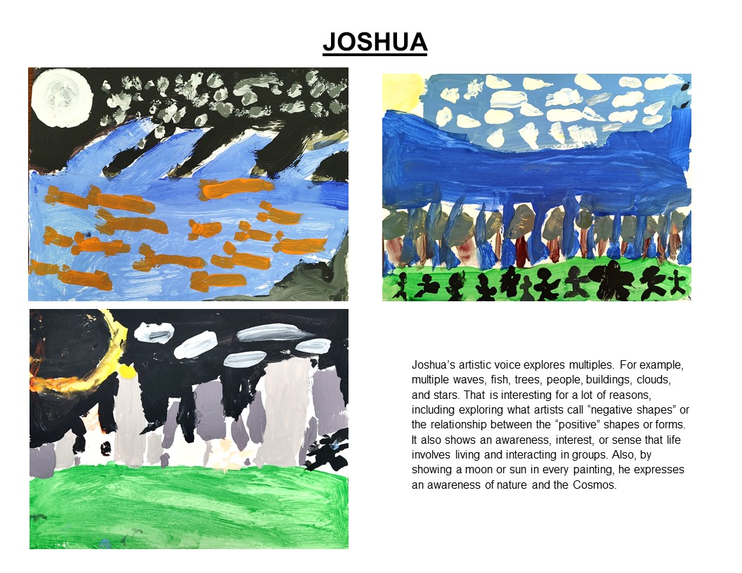 To show the emergence of a pattern, style, design, color palette, or theme expressing their artistic voice, Imogene chooses 3-4 of each of the student’s pieces. To understand and see a student’s artistic voice, Imogene looks for patterns or connections among their paintings.
